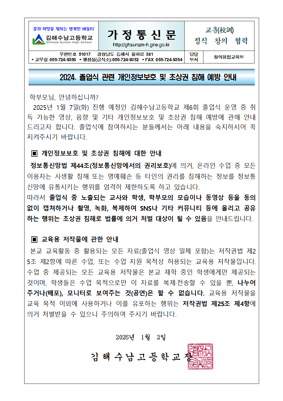 2024학년도 김해수남고등학교 제 6회 졸업식 안내